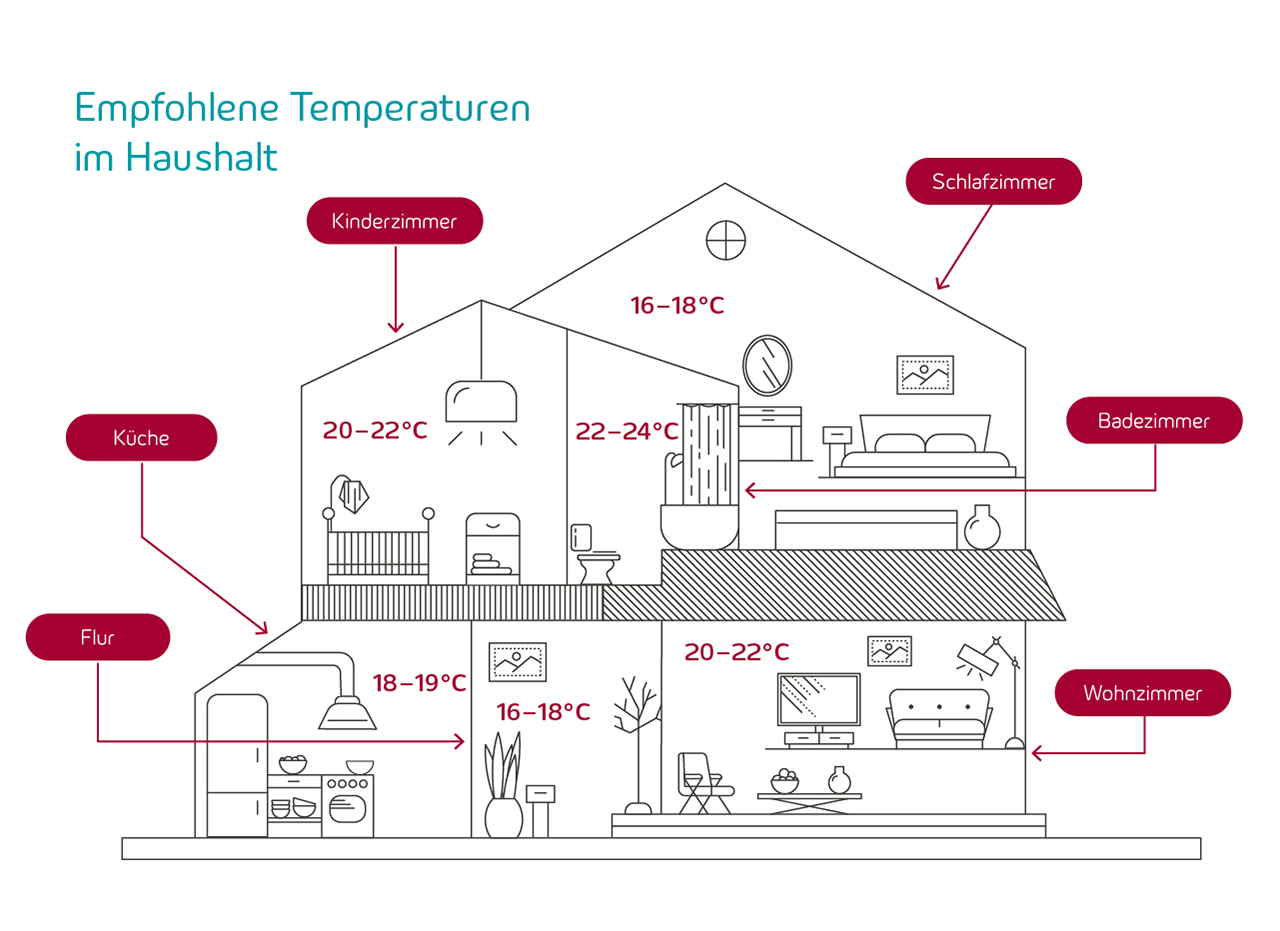 Im Energieverbrauch können schon wenige Grad einen großen Unterschied machen. Deshalb ist es wichtig, für jeden Raum die optimale Raumtemperatur zu wählen. Während im Wohnbereich eine Temperatur von 20 bis 22 Grad Celsius empfohlen wird, sind für Küche sowie Schlafzimmer Temperaturen von 17 bis 18 Grad Celsius ausreichend. Dabei ist jedoch zu beachten, dass es in einem Raum nicht kälter als 17 Grad Celsius sein sollte - sonst droht Schimmel. Auch im Badbereich kann es etwas wärmer sein. Wenn Sie nachts die Heizung abdrehen, sollten Sie darauf achten, die Räume nicht zu weit runterzukühlen. Ansonsten wird zu viel Energie zum Wiederaufheizen der Räume benötigt.